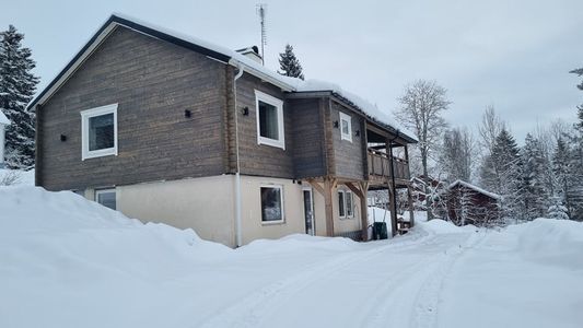 4st sovrum, stort allrum med kök och vardagsrum (bäddsoffa) tillsammans. Tvättstuga med torkskåp, torktumlare, tvättmaskin. Uppvärmt Garage för skoter.