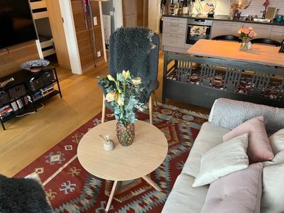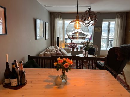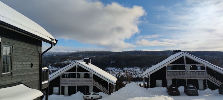 Vardagsrummet sitter ihop med köket. Det finns en soffa med plats för 2 personer samt 2 fåtöljer, fin utsikt från vardagsrummet mot fjället. TV, spel och utgång till balkong.
