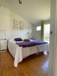The cottage has 5 beds: one room with a double bed and two small rooms, one of which has a bunk bed. The living room has a sofa, a TV and a dining table that seats 8 people. The kitchen has a dishwasher, microwave, fridge / freezer, stove and is fully equipped. Nice bathroom with shower and washer with dryer.