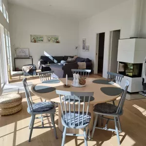 Fully equipped kitchen with fridge, freezer, stove, oven, dishwasher, large kitchen island that joins the dining area (150 cm table with 6 chairs) and the living room (corner sofa, armchair, stool, coffee table). Beautiful fireplace in the middle of the room.