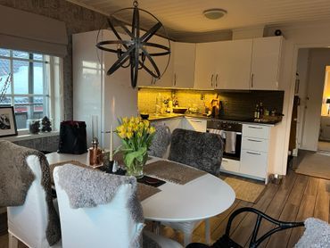 Kombinerat vardagsrum/kök. Välutrustat kök med induktionshäll, ugn, micro, kyl/frys.