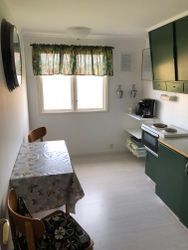 Det finns ett sovrum med tre st bäddar samt ett allrum med bord och stolar, tv och säng/soffa som man lätt gör om till två bäddar. Kök med köksutrustning, kyl, frys, spis, ugn, vattenkokare och kaffebryggare.