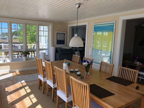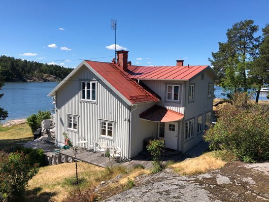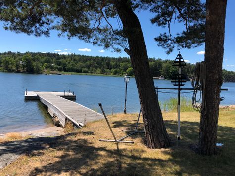 Huset omges av vatten och båtliv, egen strand och brygga lätt tillgängligt. På tomten finns även ett enklare 45m2 gästhus samt en vedeldad bastu precis vid vattnet.