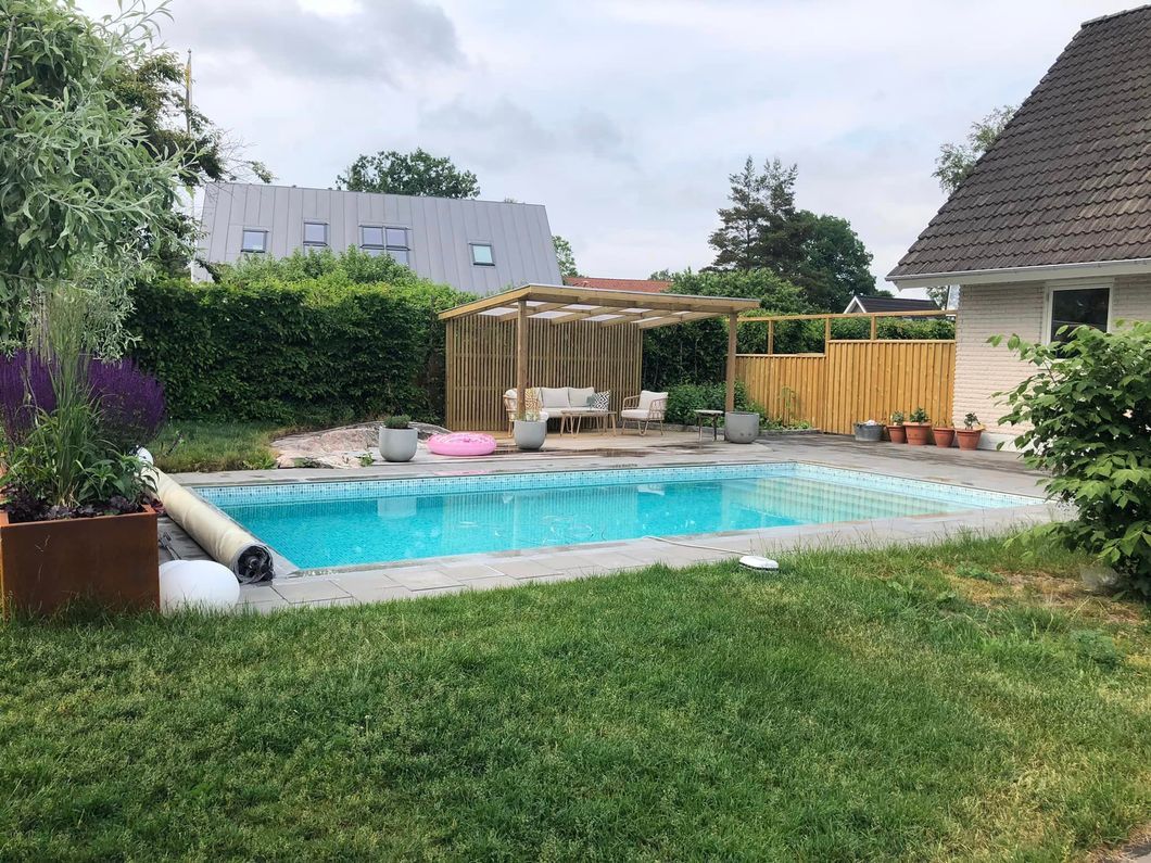 Familjevilla i mysiga Skarpäng/Täby med pool och sol hela dagen. Huset har en stor veranda med sol från morgon till kväll med flera sittplatser och bredvid poolen finns en nybyggd pergola. Huset är rymligt och det finns många sovrum och sängplatser.