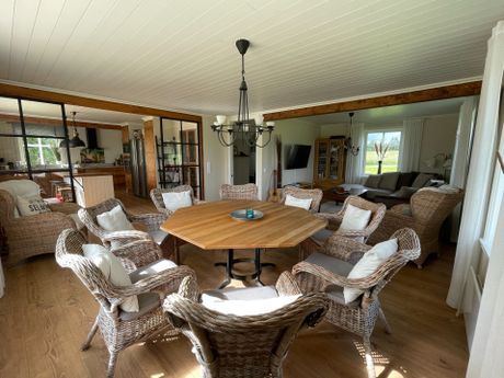 Dining area with 8 chairs, extendable with an extra table and 4 more chairs.