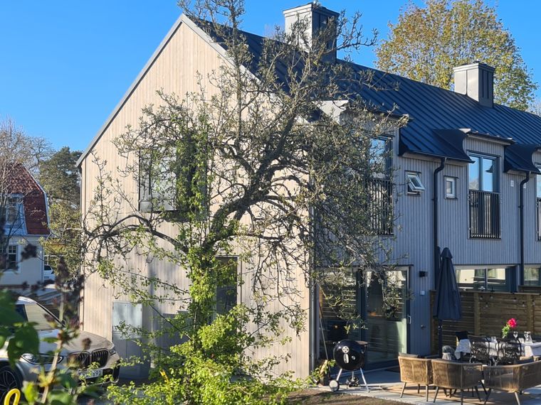 Mellan husen finns en gemensam uteplats med en en lummig trädgård.