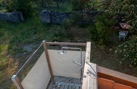 Stugan har sex sängar, varav två i sovrummet på nedre våningen. De andra finns i två separata rum på övervåningen dit en brant trappa leder. Tre sängar i det ena rummet och en säng i det andra. Det finns också en spjälsäng. På nedre plan hittar ni ett kök med enkla bekvämligheter som rinnande kallt vatten, kylskåp, kaffebryggare och elspis med ugn. Mot stentunen till har vi en härlig utedusch och handfat med varmvatten samt ett vackert utedass.