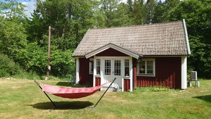 En röd stuga med vita knutar i ett rofyllt läge mitt i skogen för total harmoni!