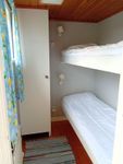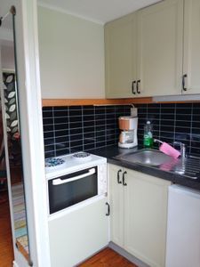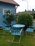 Cottage in central Borgholm with a small bedroom with a bunk bed downstairs and a bedroom upstairs with two regular beds. Downstairs there is also a small kitchen with a bench stove, oven, fridge, sink, coffee maker, kettle and crockery for 4 people. Downstairs there is also a shower and toilett as well as a small family room with a kitchen table, chairs, two armchairs with a coffee table and a TV. Access to shared garden with own garden furniture.