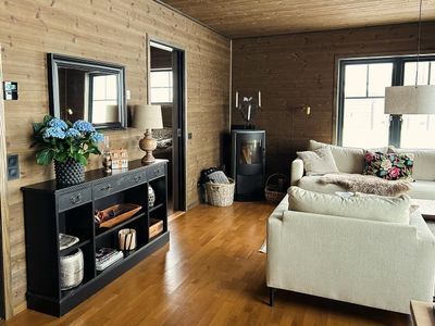 The dining area comfortably seats 6-8 guests around the table, and the view of the Storhogna slopes and mountains is captivating. You'll want to linger here after dinner or around a board game in the comfortable upholstered armchairs.