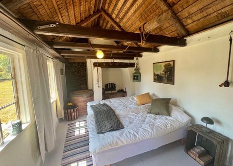 The large upstairs bedroom has a comfortable double bed (180 cm) as well as two single beds (90 cm). Downstairs, there is a spacious sofa bed for two people and an extra bed in the study, providing space for a total of seven guests. The period furnishings, with wallpapers from Josef Frank and Svenskt Tenn, evoke a turn-of-the-century style, enhanced by the beautifully painted ceilings and numerous fireplaces that provide warmth and coziness during the colder months.