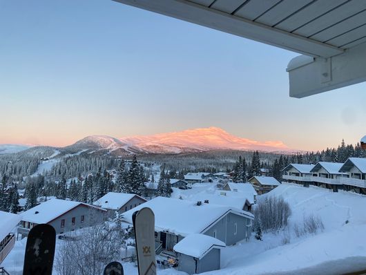 Uteplats med fantastisk utsikt över Åresjön, Åredalen och Åreskutan. Bord och grill finns i skidförrådet.