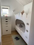 Möblerad med bäddsoffa för 2 vuxna och en våningssäng för 2 barn eller kan passa till vuxna med.
