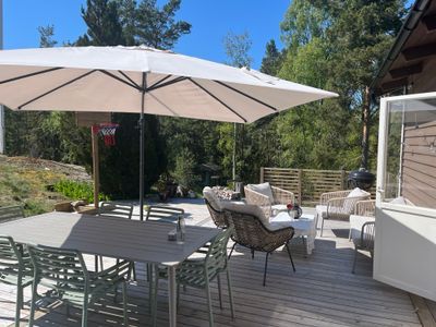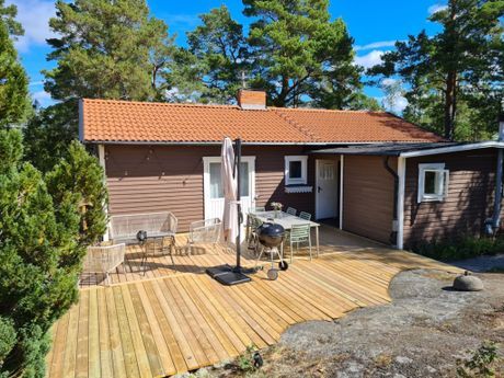 "Wonderful cabin in the Stockholm archipelago, about 1.5 hours from Stockholm. Here you have a cabin with extra charm located at the top of a hill with a large secluded forest plot to explore. Below the small hill, the sea is within bathrobe distance. The cabin has an open floor plan with lovely social areas, with an open wood stove in the center of the room. All surfaces have been carefully renovated and the equipment is of good quality. Two nice bedrooms with large beds. The patio is large and south-facing where you can enjoy the sun all day. Have a lovely lunch under the parasol or enjoy an afternoon drink in the lounge area. If it gets too hot outside, there is air conditioning inside. If you feel like swimming, it's only 100 meters down the hill to the sea. For the children, there is an exciting troll path with lots of interesting figures to look at, preferably on the way to the small beach where they can play at the water's edge if they are small, or dive from the docks if they are older. You will love it here!"