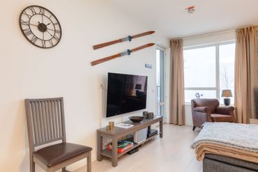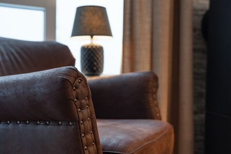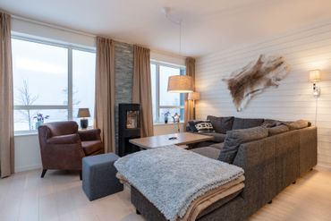 * Vardagsrum med soffa, fåtölj, TV, braskamin, Sonos och AppleTV