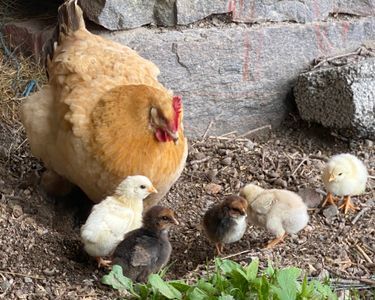 The cottage is set on a gentle slope with views of forest and open pastures where horses and goats graze. The farm is also home to chickens, peacocks, cats, and two friendly free-roaming dogs.