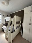 The cabin was completed for Christmas 2021. It includes two bedrooms: a master bedroom with a 160 cm double bed, and another room with a family bunk bed (90 cm on top and 120 cm on the bottom). A spacious living room and kitchen with a centrally placed wood-burning stove invite cozy evenings after a day outdoors. The kitchen is fully equipped with a dishwasher, microwave, and more. The large bathroom has underfloor heating and a shower. A separate wood-fired sauna building with space for six people is also available.