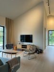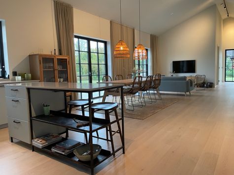 The house accommodates up to six guests and features three comfortable bedrooms with double beds (180 cm, 160 cm, and 160 cm). The bright living room and modern open-plan kitchen create a social and welcoming space. There is a bathroom, a separate guest toilet, and a laundry room for added comfort.
