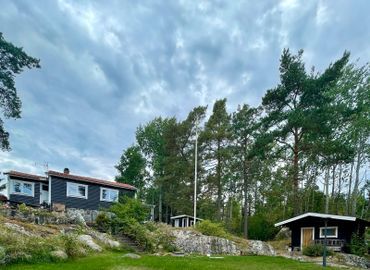 Here you can enjoy relaxing days on a large, lovely plot with a guest house, a sauna with an outdoor shower, and close proximity to a child-friendly beach with sandy shores, cliffs, a kiosk, tennis courts, and padel courts. There are four bicycles available on the property, making it easy to explore Saltarö/Skärmarö. Public transport is convenient, with direct bus 436 taking about 40 minutes from Slussen. The property is accessible by car all the way, with parking available on-site.