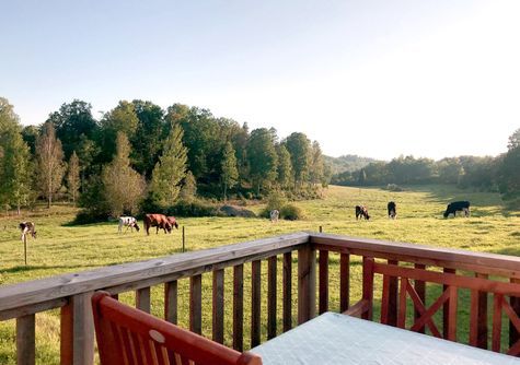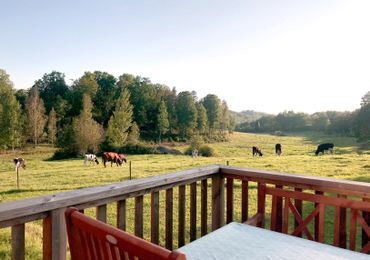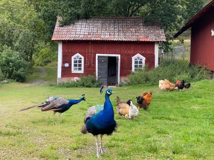 The cottage is set on a gentle slope with views of forest and open pastures where horses and goats graze. The farm is also home to chickens, peacocks, cats, and two friendly free-roaming dogs.