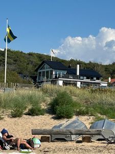 Vi har två lägenheter i förta plan i vår villa med utsikt över havet och Tylön. Granne med livräddarna och badrocksavstånd till havet och sanddynerna. Det vill säga 100 meter till sanddynerna och havet. Lägenheterna är i markplan och på cirka 30 kvadratmeter och med öppen planlösning med köksdel och rum.Stor dusch och toa. Uteplats på ca 30 kvadratmeter och under tak med matplats liten soffgrupp och grill.