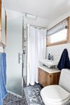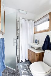 Litet kök för enklare matlagning och sovrum med två sovplatser. Är man fler inbjuder även ett loft med stege upp till ytterligare två sovplatser. På tomten står även en gäststuga med minst två sovplatser men också en spjälsäng. Toalett med dusch finns en trappa ner från huset och nås lätt från båda husen.