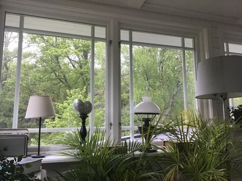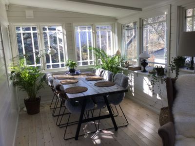 En stor inglasad veranda med plats för middagar och kontemplation.Kamin i storstugan för kyligare dagar.