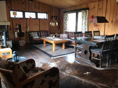 The cabin has 10 beds in four bedrooms. Spacious living room with sofas, dining