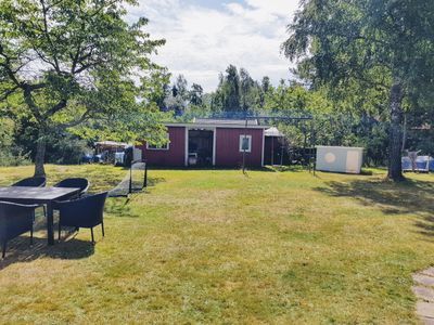 In the garden there is a storage room with a sink and a shower, washing machine and a frezer.