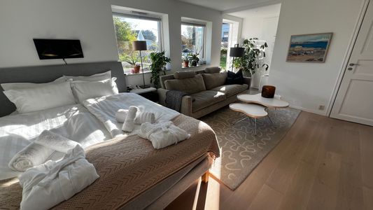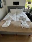 I rummet finns en säng som är 160 x 200 cm och en bekväm soffa ny från 2024