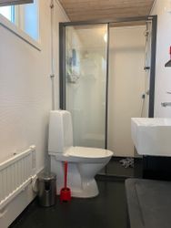Allrum med välutrustat kök (spishäll, ugn, micro, kylskåp). Sovrum med dubbelsäng och loft med två bäddar. Badrum med dusch och toa.