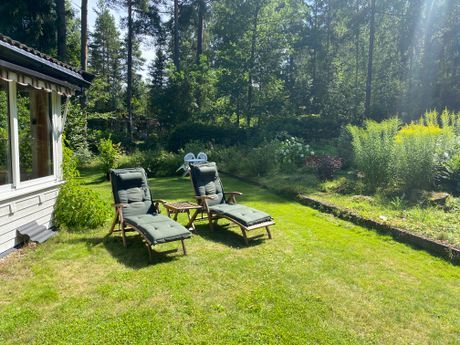 Västkuststuga (68 kvm) med hög standard, två sovrum, öppen spis, flera möblerade uteplatser och tomt med rofyllt och privat läge.