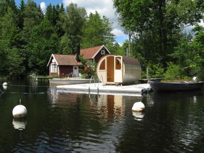 Rent a cottage in smaland south of sweden by a lake with terrace, sauna boat and
