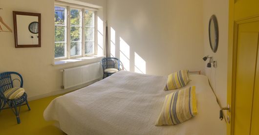 The grey-blue room is also a smaller bedroom with a window facing the sea. It has one