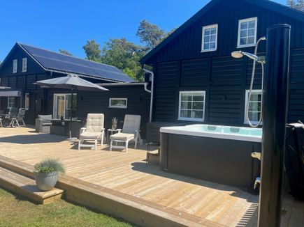 There are wooden decks facing both east and west, making sure one can enjoy both morning and evening sun. In the garden, there is a climbing frame, a trampoline and toys for the younger visitors. There is also a barbeque and outdoor furnishing to enjoy summer evenings.