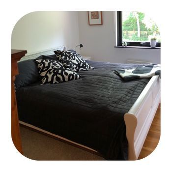 The house has one bedroom with a double bed, one bedroom with two single beds and a sofa bed, 140cm, in the large living room.