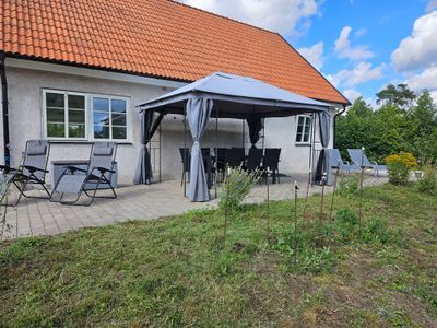 Stenlagda uteplatser runt huset med solsängar, solstolar, bord o grill. Paviljong med bord och stolar för minst 8 personer med mysig led belysning att tända senare om kvällen.