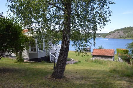The large souterrain house has very spacious social areas and large windows facing Myttingeviken. On the upper floor there is a living room with a wonderful view of the bay, a sofa group, comfortable armchairs, a fireplace and a TV. Access to a large covered balcony along the long side of the house facing the water where you can enjoy the evening sun and have nice dinners. There is a grill and 2 tables with space for 10 people. On this floor there is a a large and well-equipped kitchen with an adjacent wonderful dining room with large windows facing the lake and access to a breakfast balcony/terrace on the short side of the house. There are also two bedrooms, one with a wide single bed 120x200 cm with a spring mattress and a wardrobe wall. The second with two single beds 90x200 cm with good foam mattresses. Bathroom with shower and toilet. Hall by the bathroom with more wardrobes.