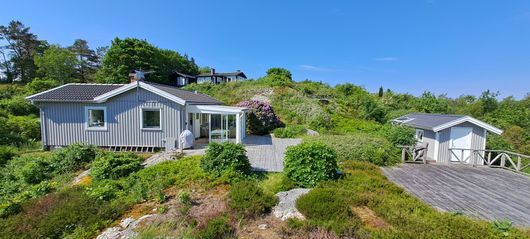 The cottage is situated on a high ground in a quiet summer house community on Instön, a beautiful, lush island accessible via a bridge from the mainland. The property is located in the midst of nature, with the sea visible in two directions. Large, connected terraces surround the house, and there is parking for 2-3 cars.