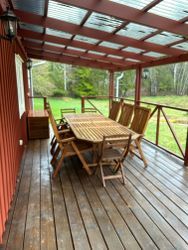 The house has three bedrooms (one of which is walk-through, see pictures). One has a double bed and a single bed, wardrobe for storage and two comfortable armchairs. A smaller bedroom with two single beds (can be put together as a double bed), wardrobe and a chair. A larger bedroom that is a walk-through to the smaller bedroom, with a double bed and sofa bed that easily makes out to a 130 cm single bed.