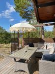 - Large terrace with lounge group, dining table and two parasols, one of which is large and functions as an extra roof.
