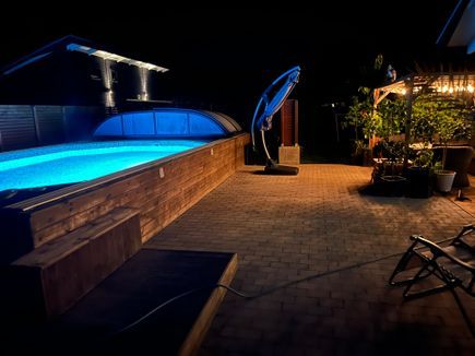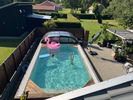 Here you have the chance to gather the whole family and friends on Öland. 3 houses with a total of 19 beds. The main house is 95m2 divided into 3 bedrooms with double beds, then there is also a sleeping loft for 2 people. Large bathroom with shower and an extra toilet inside the main bedroom. Fully equipped kitchen and large living room of about 50m2 with access to a large pool area with lounge group and bar furniture with a large outdoor kitchen that also has a solid wood-fired pizza oven, refrigerator, etc. The pool is 3.6x6.6 meters and about 125cm deep. This is a saltwater pool with a pool roof that you can also swim under. The pool is heated to about 25-32 degrees depending on the weather. There is also a large lovely garden with a hammock and patio in the shade under the trees. Kubb, croquet, darts and frisbee golf are available.