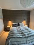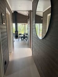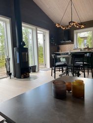 The cabin was completed for Christmas 2021. It includes two bedrooms: a master bedroom with a 160 cm double bed, and another room with a family bunk bed (90 cm on top and 120 cm on the bottom). A spacious living room and kitchen with a centrally placed wood-burning stove invite cozy evenings after a day outdoors. The kitchen is fully equipped with a dishwasher, microwave, and more. The large bathroom has underfloor heating and a shower. A separate wood-fired sauna building with space for six people is also available.