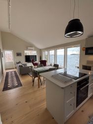 Welcome to rent our modern, newly renovated, year-round holiday home, located on a sloping natural plot (not child-friendly) in a quiet area by the sea. The house has an open floor plan with a living room, doning area and a well-equipped kitchen and panoramic windows facing the sea. There are two identical bedrooms, each with a 160 cm double bed. Bathroom with toilet and shower. The house has an open location with fresh sea breezes. Connected to the house is a spacious terrace with outdoor furniture and a grill.