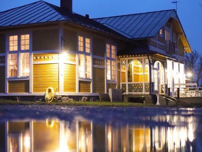 En stor herrgårdsvilla i slottspark vid sjön Båven. Huset har på nv ett stort allrum,
