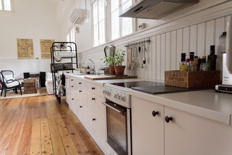 kombinerade matrummet-vardagsrummet på 90 kvm (och 6 meter i takhöjd!).