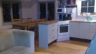 Fräscht barkök med mikro, kyl/frys, Spis etc. , matplats för 6 personer + iläggsskivor vid behov.
