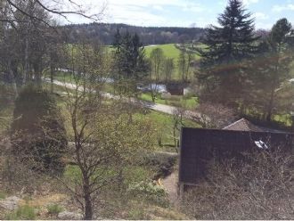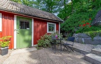 Utomhus finns en lummig trädgård och en uteplats under tak med trädgårdsmöbler och grill. Från berget finns en härlig utsikt över Bräkneåns dalgång.