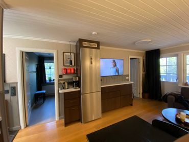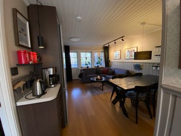 Stugan är ljus, ombonad och fullt utrustad för en bekväm vistelse.