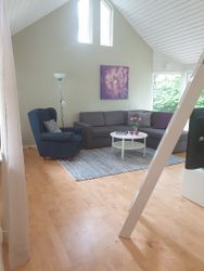 Vardagsrum med 1 bäddsoffa (140 cm) och vedkamin.